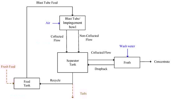 - Separator tank: This zone was assumed to behave as a perfect mixer. For metallurgical characterization, an efficiency factor (θ) was introduced to account for the net detachment of collected minerals from the Blast Tube and impingement bowl discharge. This parameter can be adjusted by the user, but an initial value of 95% was adopted for simulation purposes. Thus, the mass flowrate of collected minerals entering the froth is calculated as shown in Equation (5), where is the mass flowrate of collected minerals going out of the Blast Tube.