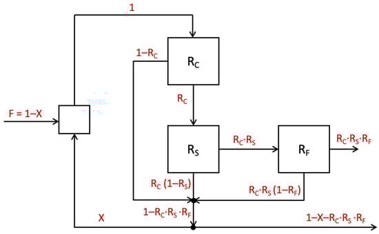 Then, solving the mass balance in the system, the total recovery (RT) in the Concorde Cell is calculated as shown in Equation (2), considering the concentrate (RC·RS · RF) divided by the feed flowrate (F = 1 − X).