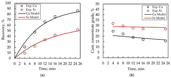 Fitting results for Cu and Fe: (a) recoveries and (b) concentrate grade profiles.