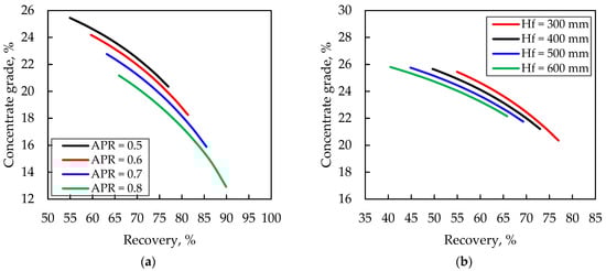 Figure 8 shows the Cu grade–recovery curves for the simulated industrial cell under a range of different operating conditions (sensitivity analysis). Thus, Figure 8a shows the effect of a varying APR (0.5 to 0.8), while Figure 8b shows the effect of changing the froth depth (HF) (300 to 600 mm). Each point along the grade–recovery curves represents a different recirculation ratio. In this analysis, values ranging from 0 to 80% were evaluated.