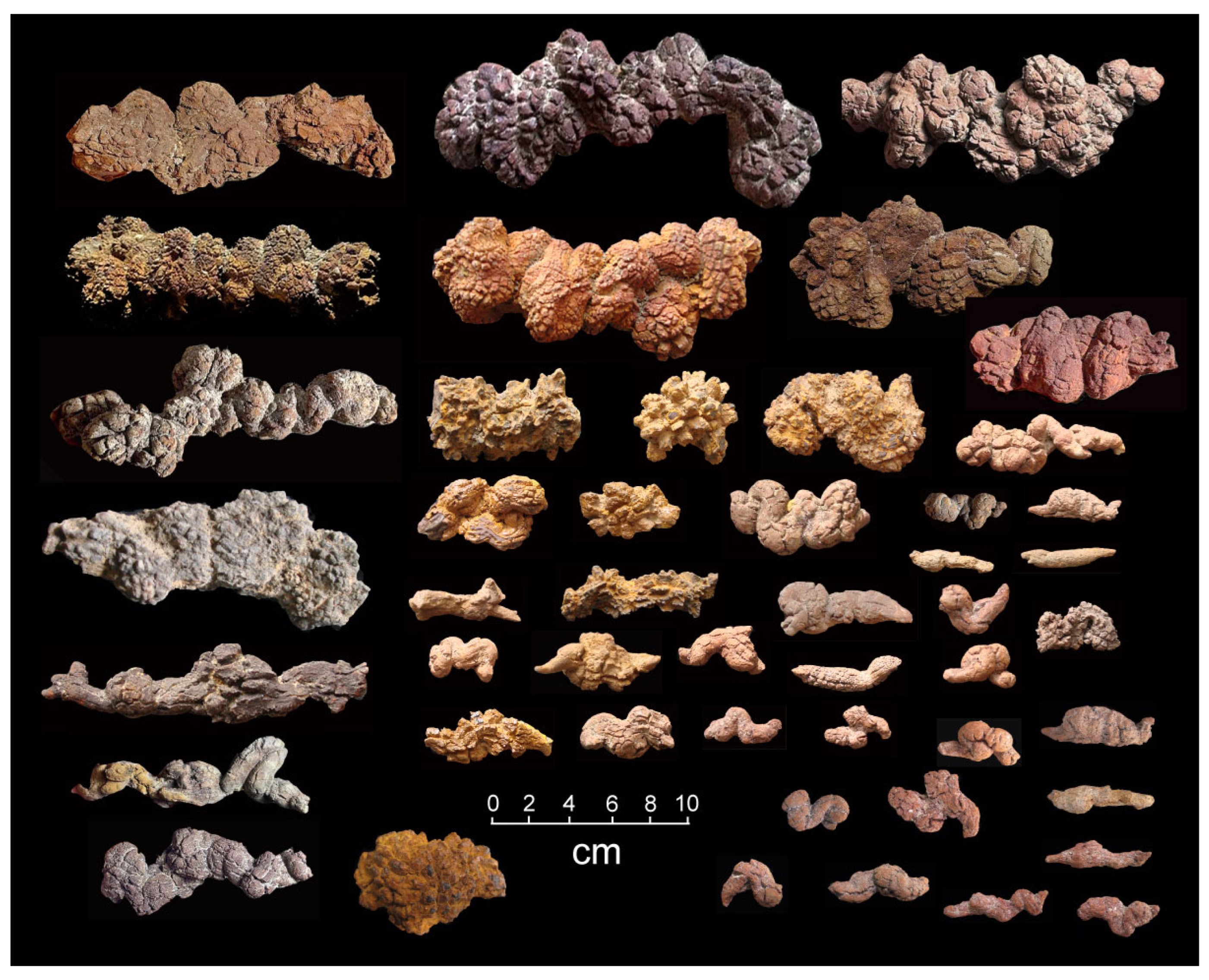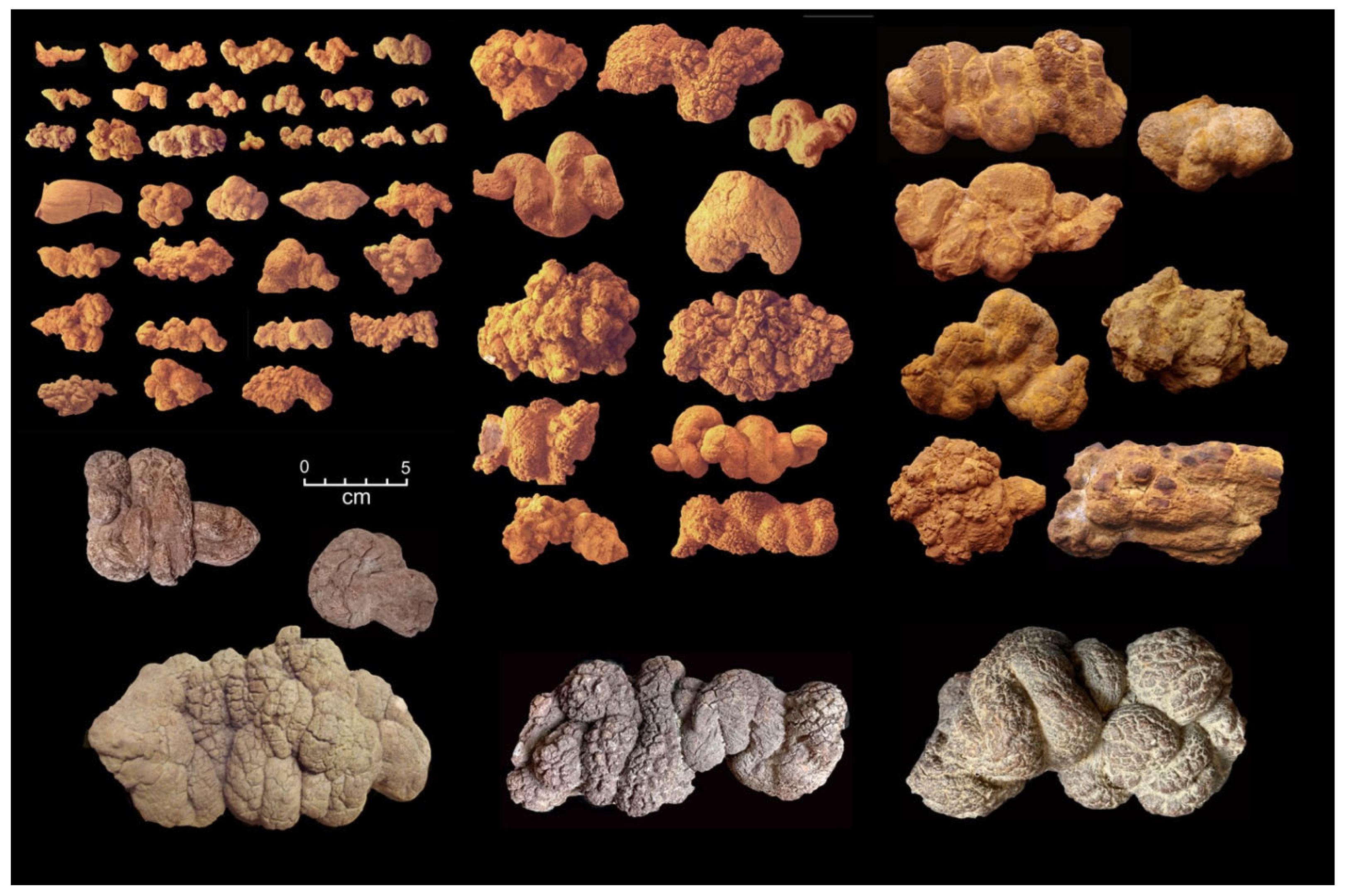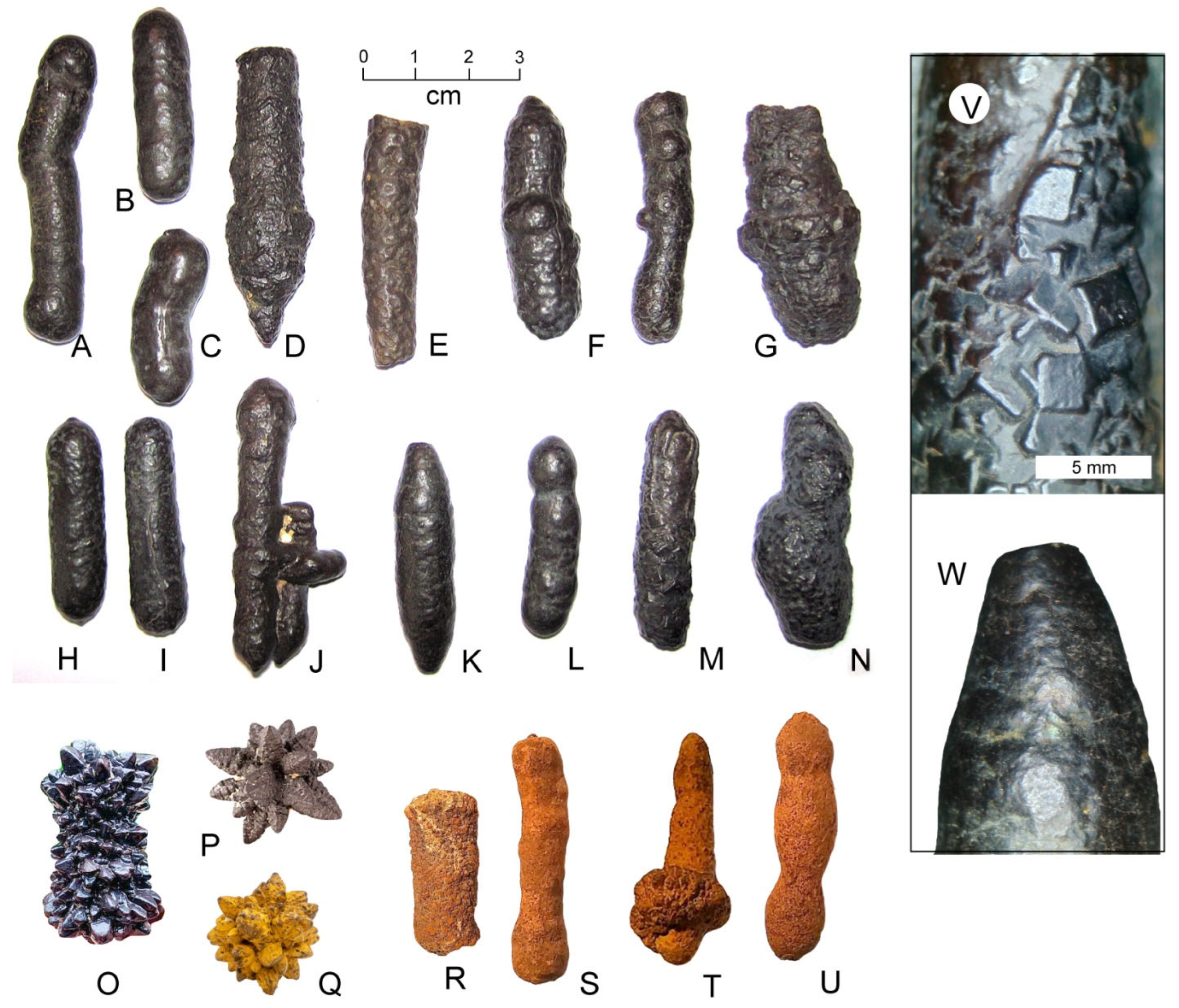 - Seilacher, A.; Marshall, C.; Skinner, C.W.; Tsuihiji, T. A fresh look at sideritic “coprolites”. Paleobiology 2001, 27, 7–13. [Google Scholar] [CrossRef]