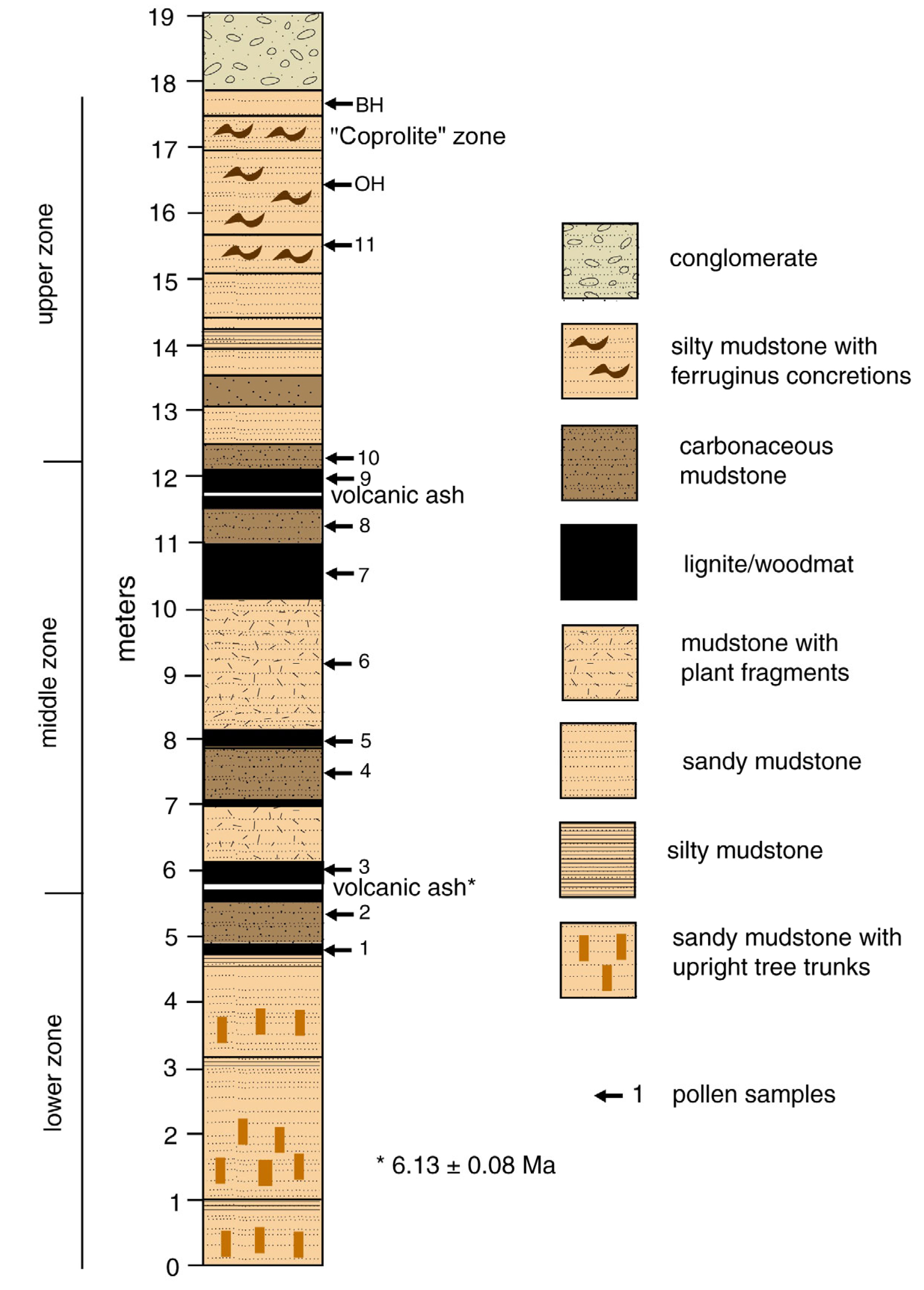 - Strata that contain ferruginous “coprolites” preserve no vertebrate fossils. Microfossils in the sediment may include pollen and diatoms.