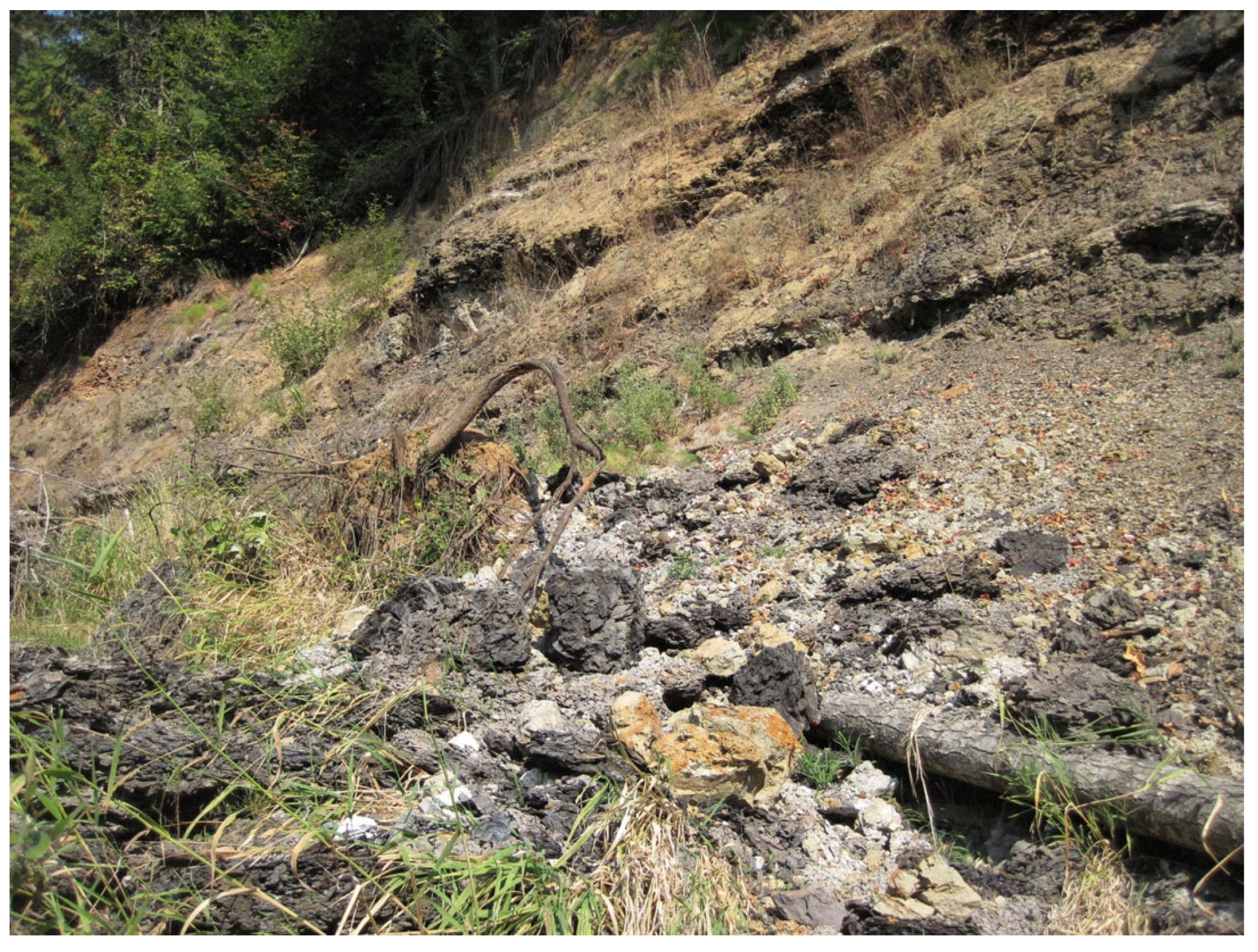 - Yancey, T.E.; Mustoe, G.E. Depositional environments of the Wiles Formation at Salmon Creek, Washington, source of siderite “coprolite” concretions. In Proceedings of the Geological Society of America Cordilleran Section, 103rd Annual Meeting, Anchorage, AK, USA, 4–6 May 2007. Abstract ID# 120944. [Google Scholar]