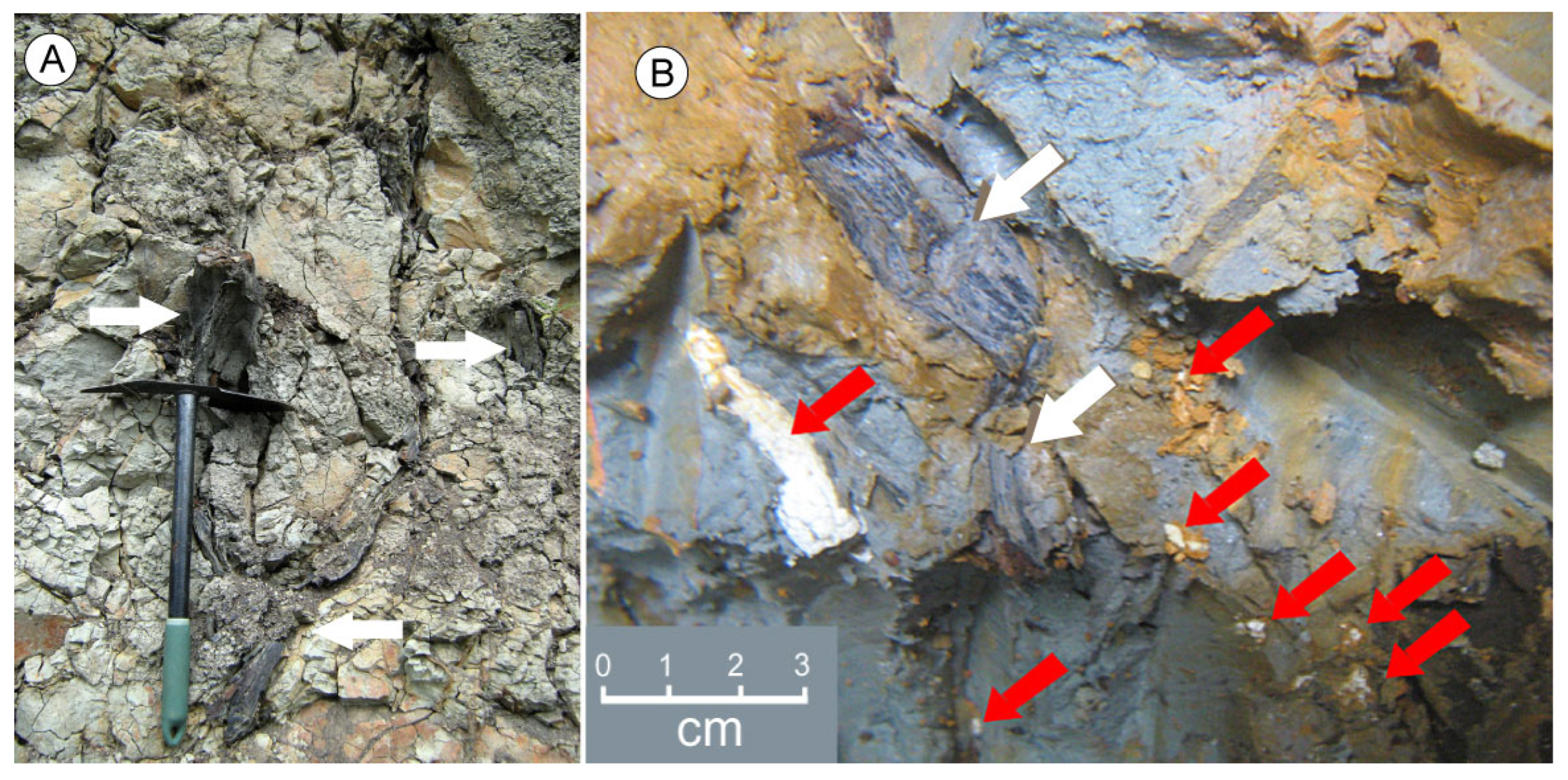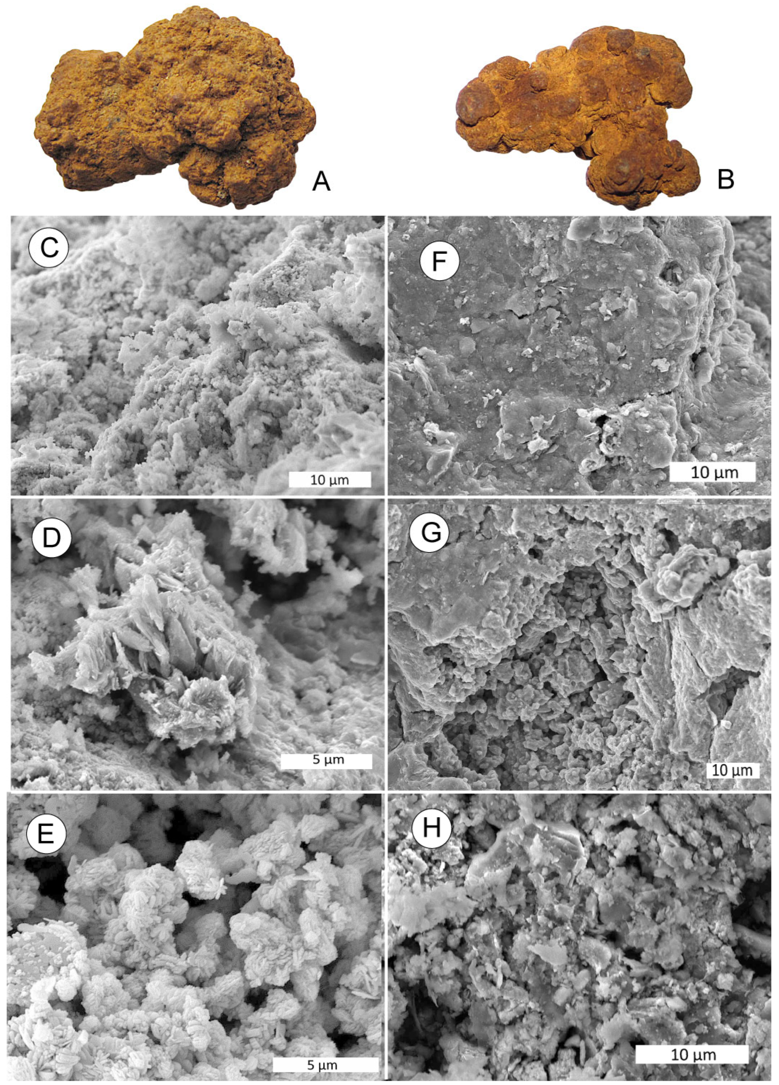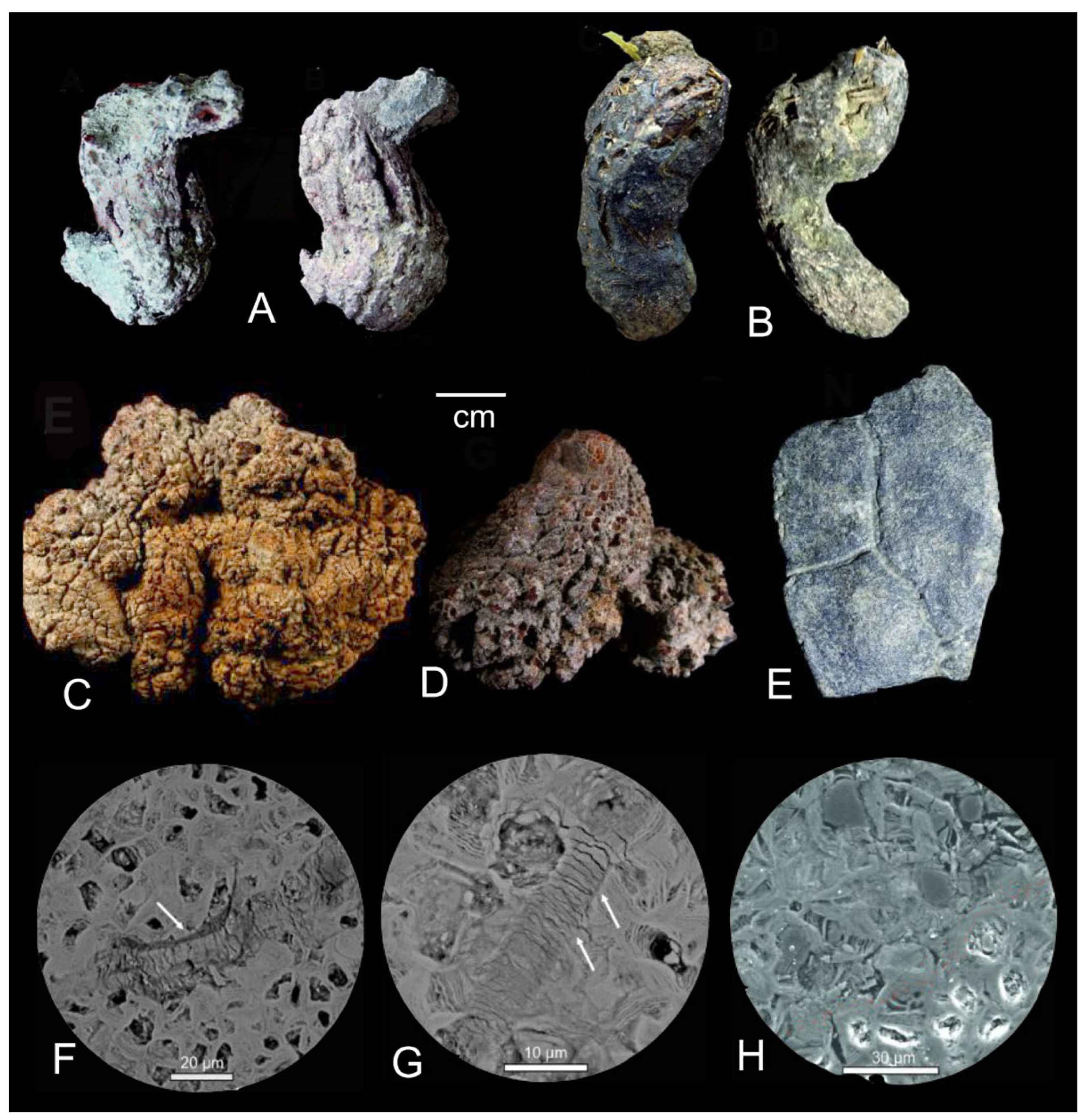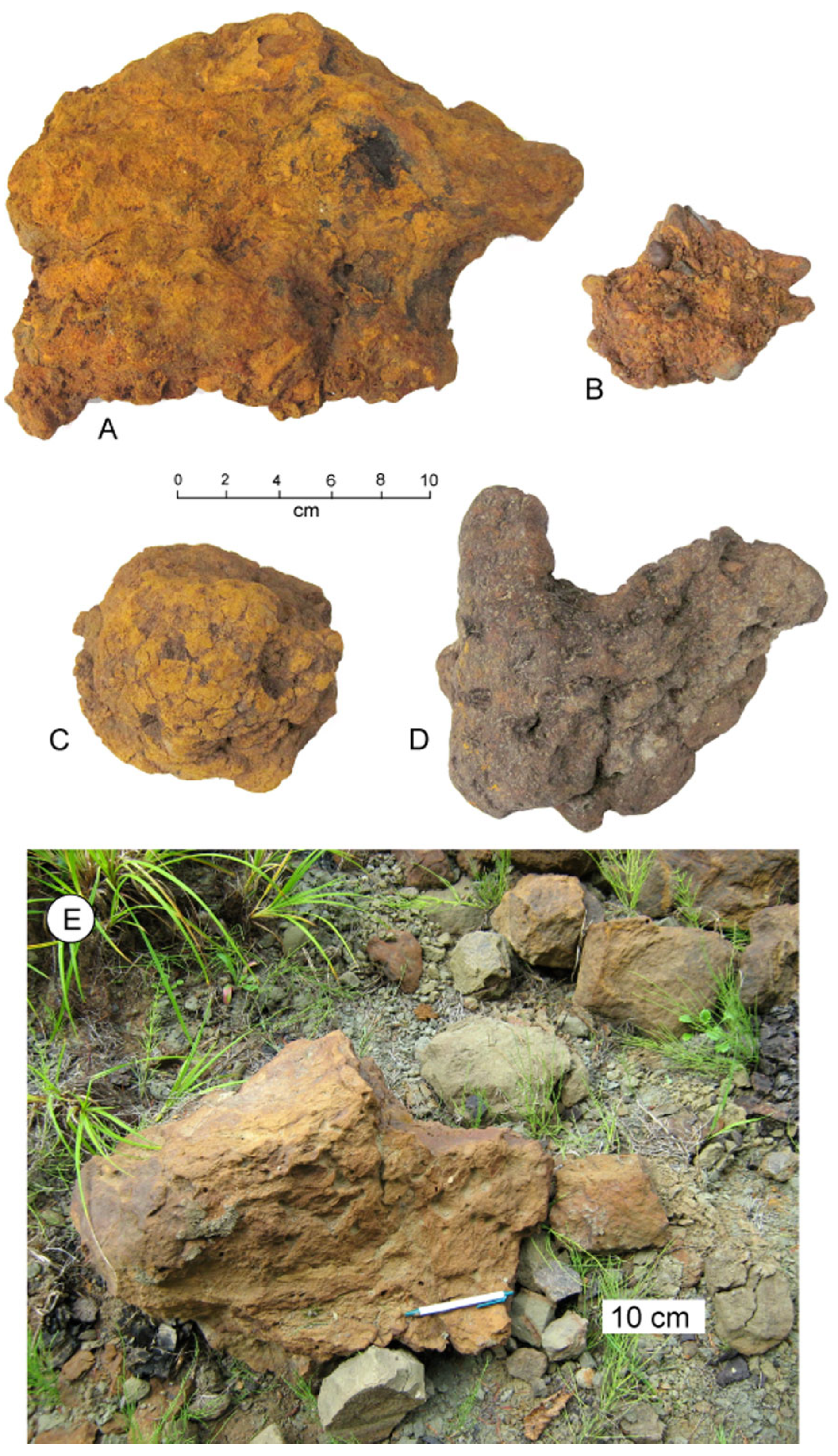 - Broughton, P.L. Ferruginous casts of bromalites in Kaolin beds: Microbial ferrihydrate-goethite transformations as early stage taphonomy in lacutrine and riparian sediments. Lethaia 2021, 54, 928–956. [Google Scholar] [CrossRef]