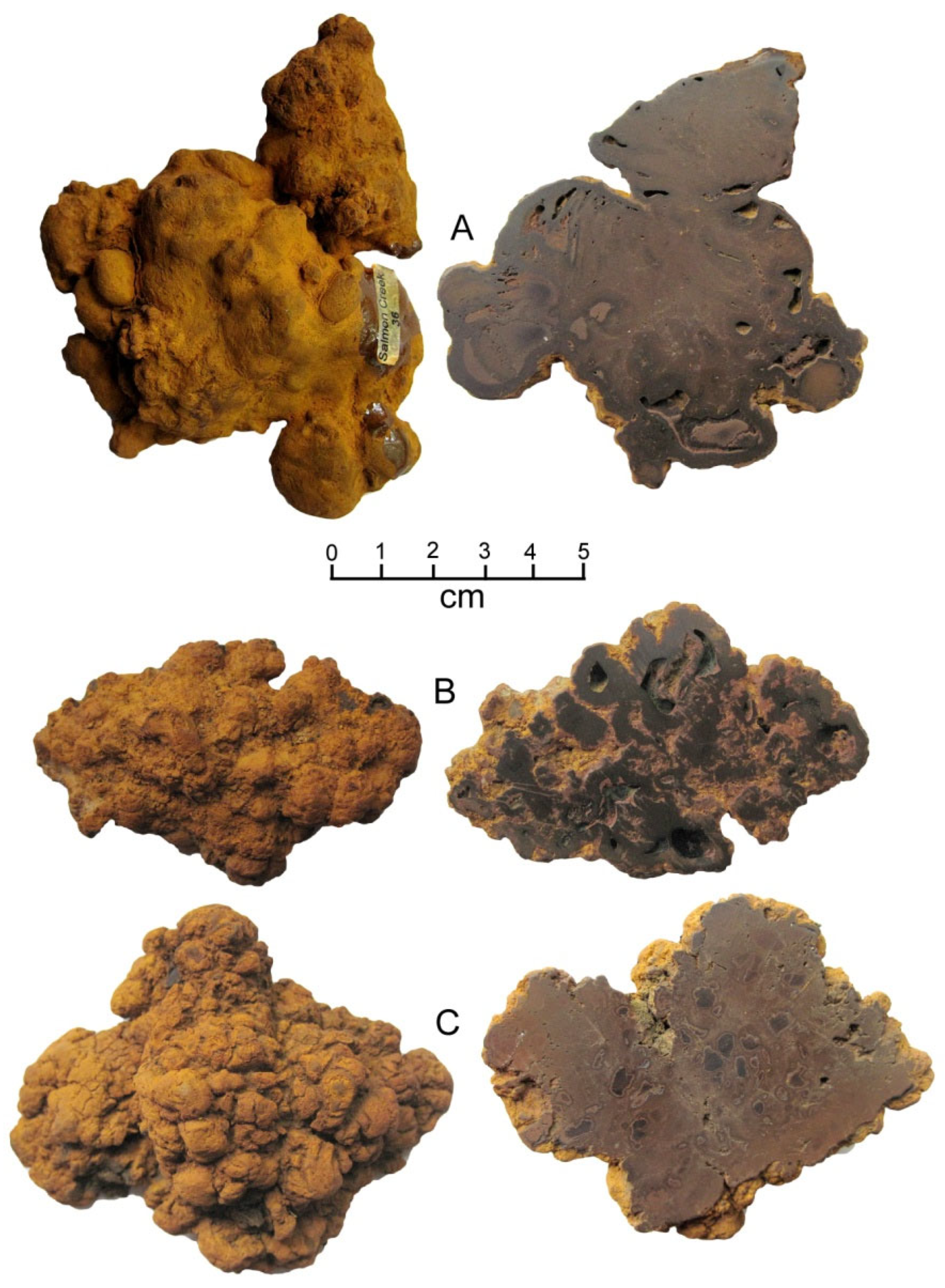 - The sizes and shapes of the ferruginous specimens have great diversity. The apparent uniformity of specimens is the result of collecting bias. At Salmon Creek, the majority of in situ specimens are very small.