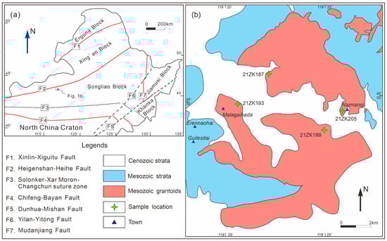 (a) Tectonic subdivisions of northeastern (NE) China (modified from [33]); and (b) Geological map of the Huolin Gol area showing sample locations (modified from [34]).