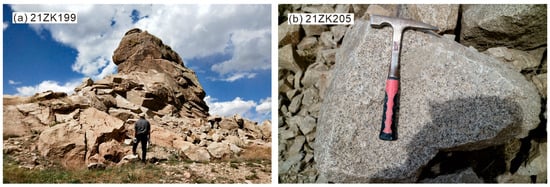Representative field photographs for the granitic intrusions in the Huolin Gol area. (a) Syenogranite in the Halejinhada pluton (sample 21ZK199). (b) Grayish-white granodiorite from Naimanqi quarry (sample 21ZK205).