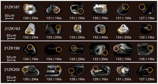 For the syenogranite collected from the Malagaihada pluton (sample 21ZK193), 24 analytical points were obtained. Twenty of these points yield 206Pb/238U ages ranging from 134 to 131 Ma, with a weighted mean age of 133 ± 1 Ma (MSWD = 0.21, n = 20). One point gives an age of 160 ± 3 Ma (Figure 5b). The youngest group of weighted mean 206Pb/238U ages (133 ± 1 Ma) represents the Early Cretaceous emplacement age of the syenogranite. The other older age (~160 Ma) represents the crystallization age of inherited zircon entrained in the magma, and the age is similar to those of Late Jurassic granitoids from the GXR [9,11].