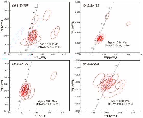 Sample 21ZK187, collected from a syenogranite southwest of Holin Gol. In this study, 24 zircon grains were analyzed. Except for nine analytical points that deviate from the concordia curve, likely due to radiogenic Pb loss, the remaining 15 analytical points fall on or near the concordia. Among these, 14 points yield a weighted mean 206Pb/238U age of 130 ± 1 Ma (MSWD = 2.10, n = 14), indicating an Early Cretaceous emplacement age for the syenogranite rather than Late Jurassic. The 206Pb/238U age of the other analytical spot is 143 ± 1 Ma, which corresponds to the age of captured zircons in the syenogranite (Figure 5a).