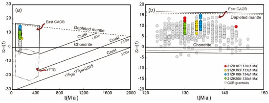 (a) Age (Ma) versus εHf(t) for zircons separated from the granitic intrusions in the eastern CAOB; (b) Age (Ma) versus εHf(t) for zircons separated from the granitic intrusions in the GXR. CAOB = the Central Asian Orogenic Belt and YFTB = the Yanshan Fold and Thrust Belt [53]. Data for the Early Cretaceous granitic rocks are from Zhang et al. [42], Cheng et al. [54], Xiong et al. [55], Yang et al. [56], Wang et al. [57], Shi [58], Zhang et al. [59], Liu et al. [60], Han et al. [61], and Zhang [62].