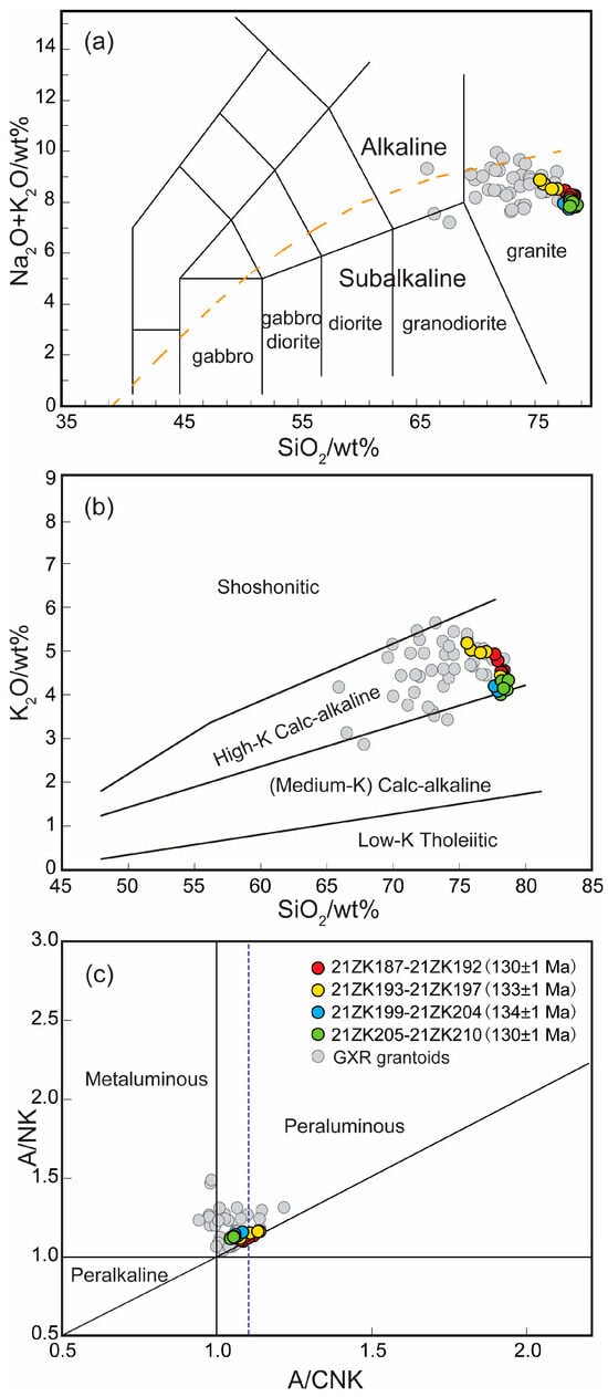 (a) Total alkali versus SiO2 (TAS) [63], (b) K2O versus SiO2 [64], and (c) A/NK versus A/CNK [65], the dashed line represents an A/CNK value of 1.1. Data for the Early Cretaceous granitic rocks are from Xiong et al. [55], Yang et al. [56], Shi [58], Zhang et al. [59], Wu et al. [66], and Gao et al. [67].