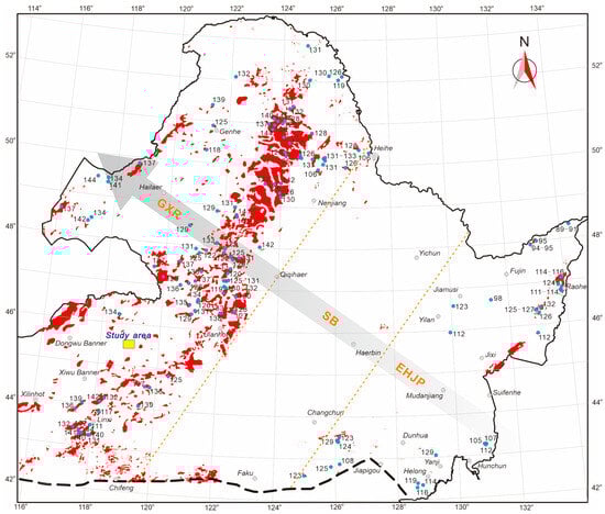 Distribution of the Cretaceous granitic rocks in NE China. The direction of the arrow roughly indicates the subduction direction of the Paleo-Pacific Plate during the Cretaceous. The figure showing sampling locations (blue dot) and age of Cretaceous granitic rocks collected in NE China. (modified from Wu et al. [9]; Table A4). The abbreviations shown on the figure are GXR—Great Xing’an Range; SB—Songliao Basin; EHJP—Eastern Heilongjiang and Jilin provinces.