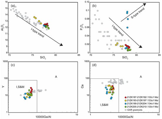 The Early Cretaceous granitic rocks studied in this study are mainly composed of syenogranite and granodiorite. In terms of mineral composition characteristics, some granitic rocks contain a small amount of amphibole, while aluminum-rich minerals such as muscovite and cordierite are absent, indicating that these rocks do not exhibit the characteristics of S-type granites and are likely of I-type genesis [9,41,54,66,70]. This conclusion is further supported by the negative correlation between Al2O3 and P2O5 with SiO2 content (Figure 10a,b)., Among them, there are four outlier sample points with abnormally high P2O5 contents, which may be related to the assimilation and contamination of water-rich magma with surrounding rocks (e.g., sedimentary rocks) during the late stage of magmatic evolution [71,72]. In addition, relatively low Y and Ce concentrations and a 10,000 × Ga/Al ratio excludes the possibility of S-type granite (Figure 10c,d). Based on the above findings, it is indicated that the Early Cretaceous igneous rocks developed in the study area are I-type granites.