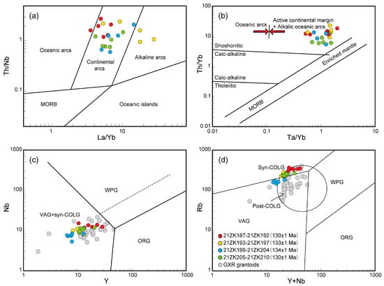 (a) Th/Nb versus La/Yb, (b) Th/Yb versus Ta/Yb (from [91,92]), (c) Nb versus Y, and (d) Rb versus (Y + Nb) diagrams of the granitic intrusions in the GXR (from [93]). The dashed line represents the upper compositional boundary for ORG from anomalous ridge segments. ORG—ocean ridge granites; WPG—within-plate granites; VAG—volcanic arc granites; Syn-COLG—syn-collisional granites; Post-COLG—post-collisional granites.