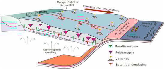 The Central Asian Orogenic Belt (CAOB), stretching from Kazakhstan in the west to eastern Siberia and the western Pacific orogenic belts in the east, is sandwiched between the East European Siberian plates to the north and the Tarim, North China plates to the south [1,2,3]. It represents one of the most significant Phanerozoic continental orogenic belts globally, characterized by extensive crustal accretion and reworking, and is also a critical polymetallic metallogenic belt [4,5,6,7]. The Great Xing’an Range (GXR), located in the eastern segment of the CAOB, has experienced intense Phanerozoic magmatic activity, particularly marked by Mesozoic intrusive rocks. These rocks are closely associated with the tectonic evolution of the Mongol-Okhotsk Ocean and the Paleo-Pacific tectonic domains [8,9,10,11,12]. Therefore, conducting petrological, geochronological, and geochemical studies on Mesozoic magmatic rocks in the GXR is crucial for understanding regional crust–mantle interaction, as well as ocean-continent and crust–mantle interactions during accretionary orogenesis and post-collisional vertical crustal growth. These studies are also essential for revealing the tectonic evolutionary history of the paleo-oceanic plate and regional mineralization [7,13,14,15].