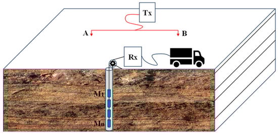 In the surface–borehole TEM method, the transmitting source—such as an ungrounded return line or a grounded electrode—is positioned above the borehole or near the surface to inject a bipolar pulse current, forming the primary electromagnetic field. The receiving probe is deployed within the borehole, where it measures the induced transient electromagnetic (secondary) field generated by subsurface geological structures at multiple depth points along the borehole or wellbore. A schematic diagram of the surface–borehole TEM configuration is shown in Figure 1. Tx denotes the grounded-wire transmitter and its associated instrumentation, whereas Rx refers to the receiving unit.