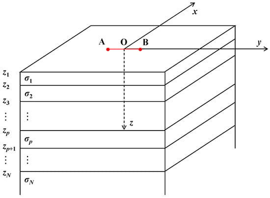 It is assumed that the earth is linear and isotropic, the electrical properties of the medium are independent of time, temperature, and pressure, and the magnetic permeability of the medium is the magnetic permeability of free space. An N-layer horizontally stratified earth model, as illustrated in Figure 2, is established. The model parameters of each layer are defined by the depth of the upper boundary and the electrical conductivity . Assuming a time-harmonic dependence of , and introducing the magnetic vector potential that satisfies the Coulomb gauge condition, the governing equations of the electromagnetic field can be written as follows [28]: