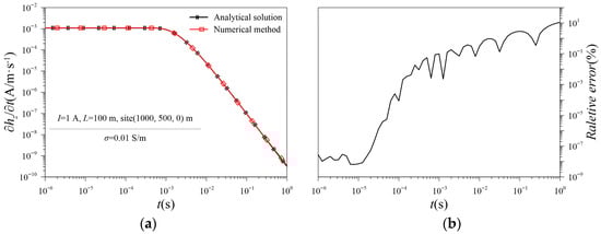 The resistivity of the uniform half-space model was set to 100 Ω∙m, and the stepping current was set to 1 A. The length of the dipole was 100 m, and it was arranged along the x-axis. The coordinates of the measuring point were (1000, 500, 0) m. At this time, the offset distance was much larger than the dipole moment, satisfying the point source assumption. As shown in Figure 3, the result of the numerical filtering algorithm is in good agreement with the analytical solution, with a relative error less than 0.1%, and it can calculate the response at the last 1 s.