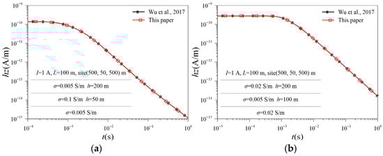 Subsequently, the calculated results obtained in this study were compared with those reported in previous literature. A layered model, shown in Figure 4, was established for this comparison. A transmitting source of length 100 m carrying a current of 1 A was aligned along the y-axis. A borehole was situated at coordinates (500, 50, 0) m, with observations taken at a depth of 500 m. The comparison shows that the results produced by the numerical filtering algorithm in this study are in good agreement with those obtained by Wu [33], thereby confirming the validity and reliability of the proposed method.