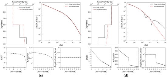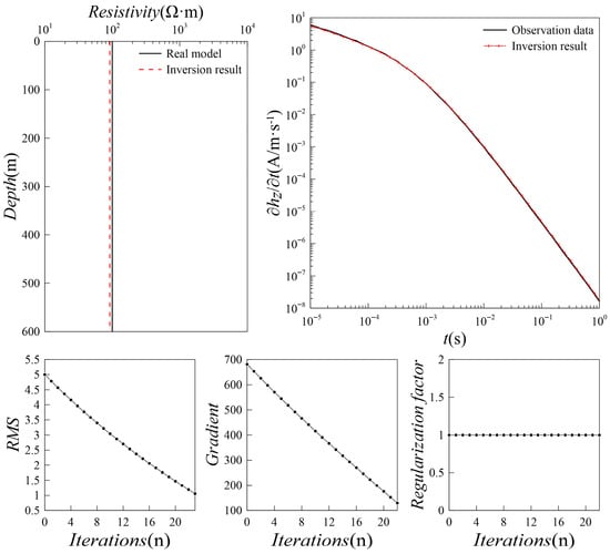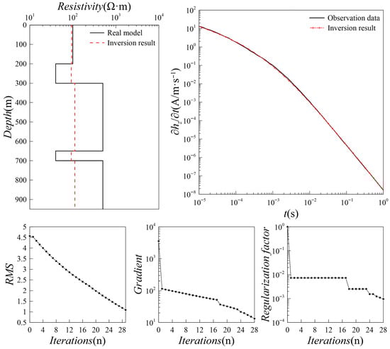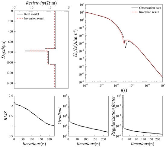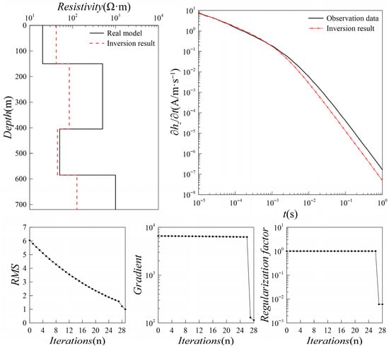 To obtain more comprehensive information about the electrical structure of the formation, the response signal was used to perform surface–borehole TEM 1D inversion [17] due to its sensitivity to resistivity differences [36]. A 5% Gaussian noise was added to the observation data. In the study, the upper and lower limits of the conductivity were set to 10 S/m and 0.0001 S/m, respectively. The long wire transmitter emitted a stepping current of 1 A. The initial regularization factor α was set to 1.0. To avoid negative values of the model parameters, the initial step size was set to 0.1. When the root mean square (RMS) error of two consecutive iterations decreased slowly, the constraint of the current regularization factor α was too strong, and the regularization factor was updated using Equation (29).