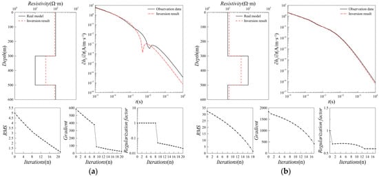 It should be noted that when the model parameters approach their preset upper or lower limits, extreme values may occur during the gradient calculation process, potentially leading to instability or even failure of the inversion. To mitigate this issue, the permissible range of conductivity parameters should be set as wide as possible. This approach ensures a smoother inversion process and enhances the reliability of the final results.