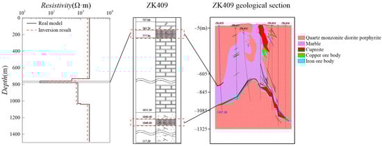 As shown in Figure 9, the inversion results obtained from the borehole-model-based forward data are compared with the geological profile in Figure 10. The comparison demonstrates that the proposed algorithm accurately reconstructs the copper–iron ore layer, which is approximately 20 m thick and located at a depth of about 760 m. However, for the deeper ore body situated near 1050 m depth with a thickness of only 10 m, the 1D inversion fails to clearly resolve the target. This limitation underscores the inherent challenge in detecting thin, deeply buried conductive layers using conventional 1D inversion methods.