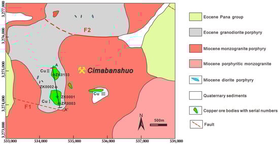 The geological background of the Cimabanshuo deposit has been comprehensively described in previous studies [12,13], and its key features are briefly reviewed here. Preliminary estimates indicate that the deposit hosts more than 0.5 Mt of copper resources and shows favorable geological conditions for mineralization [12]. Exposed strata within the deposit area belong to the Eocene Pana Formation, mainly distributed in the northeastern part of the deposit (Figure 2), and are composed predominantly of tuff and dacitic porphyry. Two major fault systems are developed in the area, including the nearly east–west-trending F1 and the northwest-trending F2 (Figure 2).