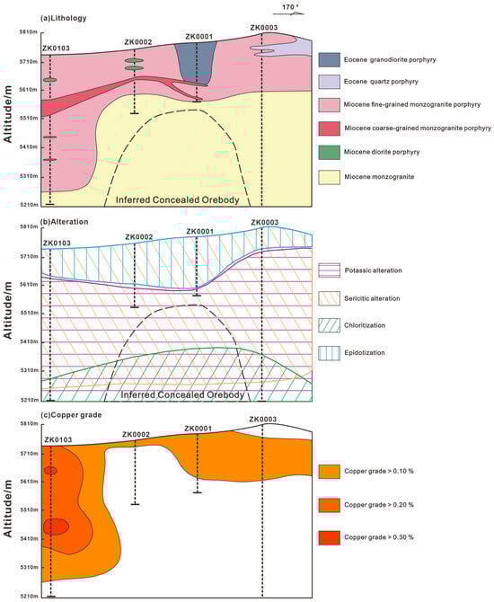 Lithology (a), alteration (b), and copper-grade distribution (c) maps of section A-A′ in the Cimabanshuo deposit.