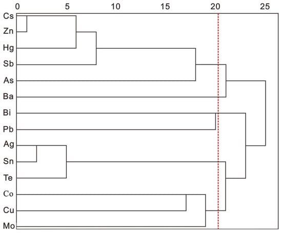 R-type cluster analysis groups variables according to the principle of “like attracts like” revealing differences in geochemical behaviors among elements [44]. In this study, the raw data of each variable were standardized and clustered using the between-groups linkage method. The correlation coefficients among variables were calculated to produce a dendrogram (Figure 6). With a linkage distance of 20 as the boundary, the elements can be divided into five groups.
