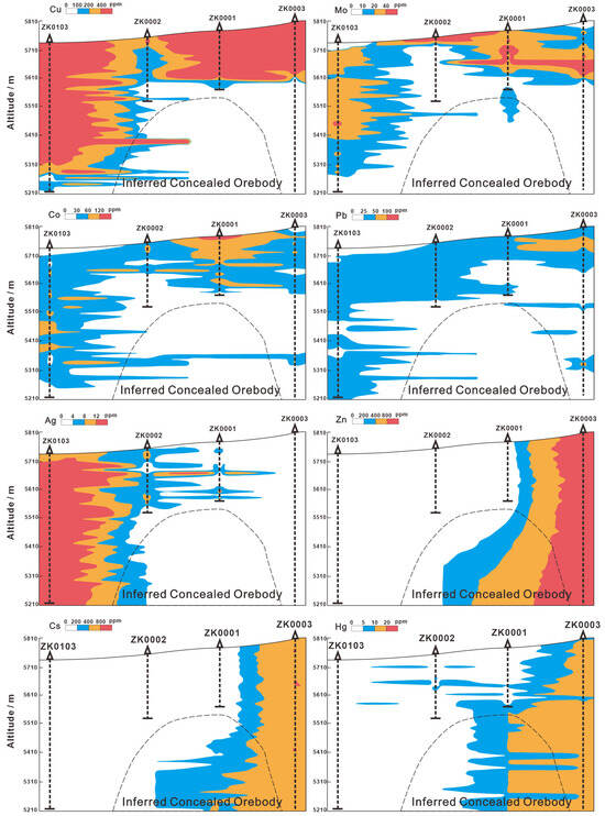 These elements show clear three-tiered zoning, particularly Zn, As, and Ba, which exhibit complete and well-defined inner, middle, and outer zones. Their inner or middle anomalies mainly occur in the southeastern part of the profile, overlapping or extending slightly deeper than the Cu orebody. These features indicate that they represent the frontal halo elements in the hydrothermal system [48].
