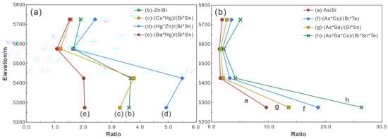 Before calculating this ratio, differences in elemental magnitudes were normalized by introducing the contrast coefficient, which characterizes the degree of enrichment of an element [11,43]. The contrast coefficient is defined as the ratio of the average content of an element in a given sublevel to its background value, which is taken as half of the anomaly lower limit [11] (Table 4). Based on the ratio between front- and tail-halo element assemblages, eight geochemical evaluation indices were constructed [8,11] (Table 6; Figure 8): (a) As/Bi; (b) Zn/Bi; (c) (Cs × Hg)/(Bi × Sn); (d) (Hg × Zn)/(Bi × Sn); (e) (Ba × Hg)/(Bi × Sn); (f) (As × Cs)/(Bi × Te); (g) (As × Ba)/(Bi × Sn); (h) (As × Ba × Cs)/(Bi × Sn × Te). For convenience, these eight indices are subsequently referred to by their letter labels (a–h) in the figures and text, with their full formulae listed in Table 6.