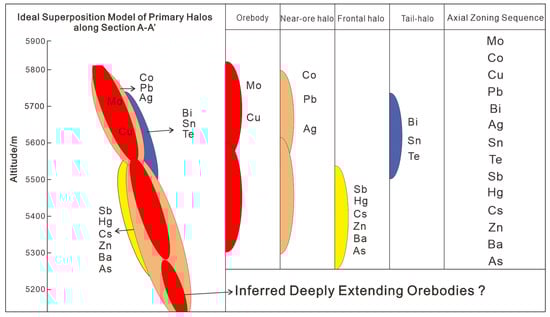 Elemental primary halo zonation map along the A-A′ section of the Cimabanshuo deposit.