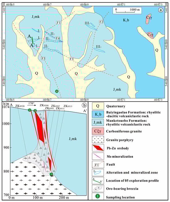 The stratigraphic units consist of the Upper Jurassic Manketouebo Formation (J3mk) and Lower Cretaceous Baiyin’gaolao Formation (K1b) from west to east. Upper Jurassic Manketouebo Formation volcanic–sedimentary rocks are composed of rhyolite, lithic crystal tuff, rhyolitic tuff, and volcanic breccia. Lower Cretaceous Baiyin’gaolao Formation volcanic–sedimentary rocks comprise rhyolite, dacite tuff, and volcanic breccia (Figure 2a), yielding a zircon U-Pb age of rhyolite at 127.6 ± 1.2 Ma [29]. The alteration and mineralization zone is hosted within the Upper Jurassic Manketouebo Formation (Figure 2a).