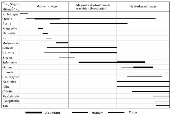 Field investigation, petrographic observations, and replacement relationships indicate a paragenetic sequence during the formation of the Wunuer Pb-Zn-Ag-Mo deposit. The ore mineralogy and associated wall-rock alterations are briefly summarized below, within a framework of three mineralization stages (Figure 3a,e,h and Figure 4).