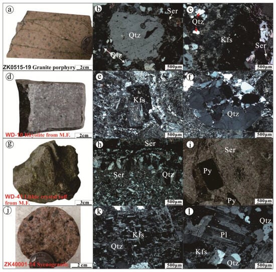 (a) Hand specimen of granite porphyry (sample no: ZK0515-19). (b,c) The microphotograph of granite porphyry showing porphyritic texture. (d) Hand specimen of the rhyolite (sample no: WD-10). (e,f) The microphotograph of the rhyolite with the flow structure. (g) Hand specimen of the lithic crystal tuff (sample no: WD-41). (h,i) The microphotograph of the lithic crystal tuff mainly composed of quartz, pyrite, and sericite. (j) Hand specimen of syenogranite (sample no: ZK40001-14). (k)The microphotograph of the syenogranite showing granitic texture. (b,c,e,f,h,i,k,l), crossed polars. Abbreviations: Kfs: K-feldspar, Py: pyrite, Qtz: quartz, Ser: sericite. Pl: plagioclase.