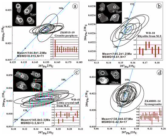 Eleven spots analyses on zircons from the granite porphyry (ZK0515-19) yielded concordant 206Pb/238U ages ranging from 145 to 146 Ma (Table S1), with a weighted mean age of 144.8 ± 1.2 Ma (MSWD = 0.015; Figure 6a). Seven zircon spots were obtained from the rhyolite sample (WD-10) showing concordant 206Pb/238U ages of 144 to 147 Ma, with a 206Pb/238U-207Pb/235U weighted mean age of 145.2 ± 1.2 Ma (MSWD = 0.61; Figure 6b). Eleven zircon grains from the lithic crystal tuff sample (WD-41) showed concordant 206Pb/238U ages of 136~155 Ma, with a 206Pb/238U-207Pb/235U weighted mean age of 145.8 ± 3.3 Ma (Figure 6c). Seventeen spot analyses on zircons were collected from the syenogranite (ZK40001-14), yielding concordant 206Pb/238U ages ranging from 137 to 142 Ma, with a weighted mean age of 138.8 ± 0.87 Ma (MSWD = 0.42; Figure 6d).