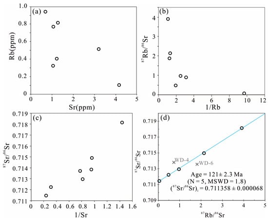 Furthermore, the 87Rb/86Sr versus 1/Rb and 87Sr/86Sr versus 1/Sr curves are not linear (Figure 7b,c), suggesting the Rb-Sr isochron age was more reliable than non-pseudoisochrons. Figure 7d shows a sphalerite Rb-Sr isochron drawn using the Rb-Sr isotope composition data. The data of the five samples can be observed to fall along a straight line with outliers of two samples (WD-4, WD-6), yielding an isochron age of 121 ± 2.3 Ma (MSWD = 1.8) with (87Sr/86Sr)i = 0.711358 ± 0.000068.