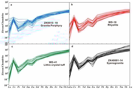 Chondrite-normalized REE patterns (a–d) for zircon grains from the igneous rocks in the Wunuer deposit.