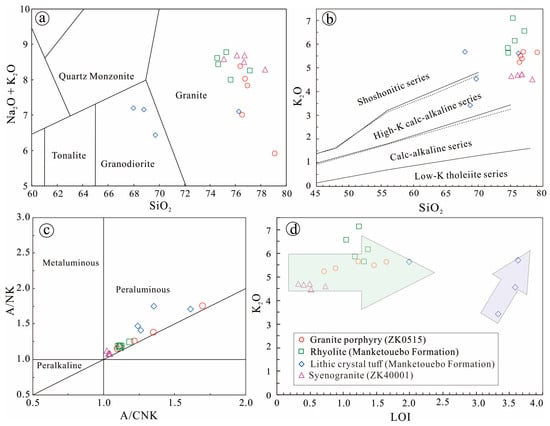 (a) Total alkali–silica (TAS) diagram (after [40]). (b) K2O vs. SiO2 diagram (after [41]). (c) A/CNK vs. A/NK diagram (after [42]). (d) K2O vs. LOI diagram. LOI: loss on ignition. The green and purple arrows represented the trend line of various rocks.