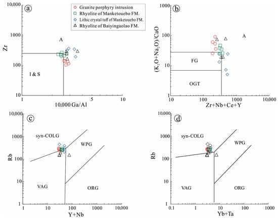 (a) Zr vs. 10000Ga/Al diagram (after [43]). (b) (K2O + Na2O)/CaO vs. Zr + Nb + Ce + Y diagram (after [43]). (c) Rb vs. Y + Nb diagram (after [44]). (d) Rb vs. Yb + Ta diagram (after [44]). The data of rhyolite of Baiyingaolao Formation are collected from [25]. FG: fractionated granite, OGT: unfractionated M, I, and S-type granites, WPG: within plate granite, VAG: volcanic arc granite, syn-COLG: syn-collision granite, ORG: ocean ridge granite.