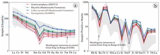 (a) Chondrite-normalized rare earth element (REE) patterns for the igneous rocks from the Wunuer deposit (after [45]). (b) Primitive mantle-normalized spider diagrams for the igneous rocks from the Wunuer deposit (after [45]). The gray range represents the data of the metallogenic intrusions in the central Great Xing’an Range (CGXR) (after [27]).