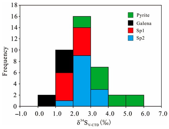 Histogram of sulfur isotope values of sulfides from the Wunuer deposit. The data of various generations of sphalerite (Sp1 and Sp2) are collected from [19].