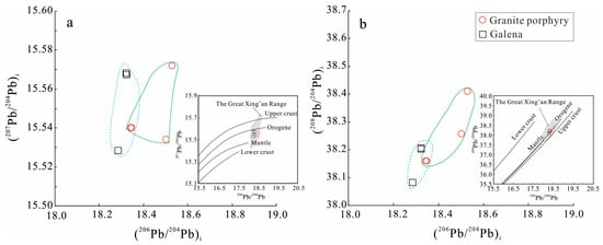 Lead isotopes generally do not experience significant fractionation during mineralization and hydrothermal processes. Furthermore, common sulfide minerals (e.g., pyrite and galena) contain low U and Th contents, resulting in insignificant production of radiogenic lead. Therefore, the Pb isotopic compositions of these minerals robustly reflect the signature of their source materials [54]. The lead isotope compositions of the galena and ore-related granite porphyry in the Wununer deposit are consistent with those of the metallogenic intrusions in the Great Xing’an Range [27]. Pb isotope compositions of galena from the hydrothermal stage display a concentrated range, which is similar to that of the granite porphyry associated with the mineralization (Figure 14a), suggesting that the granite porphyry intrusion was a potential source of lead and other metals for hydrothermal mineralization. In the 206Pb/204Pb vs. 208Pb/204Pb diagram, all data align along the orogenic evolution line, but the lead isotope ratio of galena is significantly lower than that of granite porphyry intrusion (Figure 14b). This indicates that the ore-forming materials must have been derived primarily from the granite porphyry, but a minor component of lead from the surrounding country rocks.