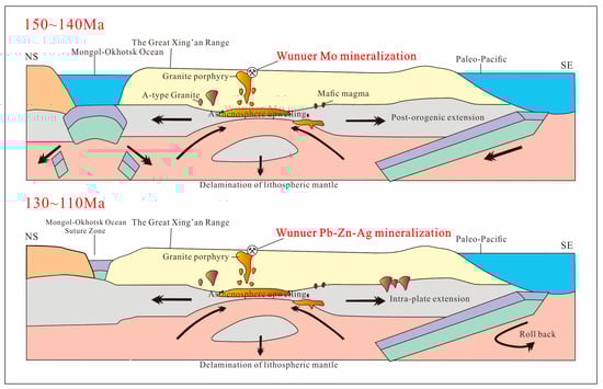 The Late Jurassic–Early Cretaceous (150~140 Ma) represented a major metallogenic epoch for tin, copper, and lead–zinc deposits in North China. Many studies have shown that the magmatic and related mineralization events in this region were predominantly triggered by the subduction of the Mesozoic Paleo-Pacific Plate [2,4,8,21,48,49,57]. It is generally believed that the large-scale mineralization was associated with lithosphere thinning, resulting from the upwelling of the asthenosphere under a post-orogenic extension tectonic regime in eastern China [4]. A shift in the subduction direction of the Paleo-Pacific Plate from westward to northwestward during the Cretaceous induced a transition from compressional to extensional tectonics and, subsequently, led to large-scale delamination of the thickened lower crust and lithospheric mantle, thus promoting the emplacement of abundant A-type granites [4,50,51]. Therefore, magmatism and metal mineralization in the Great Xing’an Range reached their peak during this period [52,53], forming a series of deposits, including Chalukou Mo deposit (148~144 Ma [54,55]), Huoluotai Cu-Mo deposit (146.75 Ma [56]), Huanggang Fe-Sn deposit (145.3 Ma [33,57]), Bianjiadayuan Ag-Pb-Zn deposit (143~140 Ma [25,33]), Dajing Sn-Cu deposit (144~138 Ma [28,58]), and Wunuer Mo deposit (144.8~145.8 Ma).