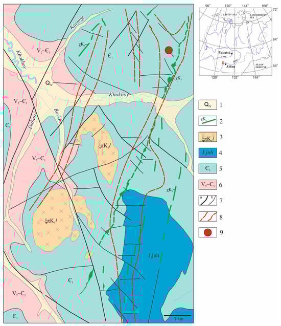Geological map of the Khokhoy ore field (Aldan Shield, Yakutia, Russia) [1] with changes: 1—Quaternary deposits; 2—subalkaline dikes; 3—Lebedinsky monzonitesyenite plutonic complex; 4—Yukhtinskaya suite, inequigranular, oligomictic sandstones, lenses and interlayers of gravelstones, conglomerates, siltstones; 5—Lower Cambrian deposits of the Ungelinskaya, Tumuldurskaya, and Pestrotsvetnaya suites, dolomites with interlayers of marl and marly dolomites, 6—Vendian–Lower Cambrian deposits of the Ust-Yudomskaya suite, bituminous dolomites with thin interlayers of marly dolomites; 7—faults: (a) main, (b) secondary; 8—karst development zones; 9—Khokhoy deposit.