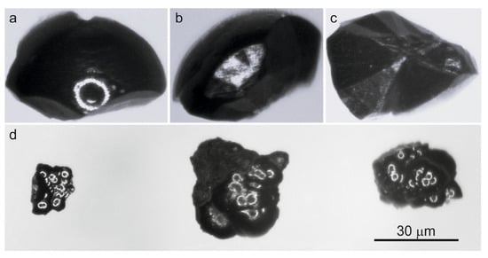 Aggregates of colloform texture prevail (Figure 2). A transition of sectorial crystals to spherical shapes is observed (Figure 2a–c). Colloform shapes and spherulitic aggregates are common (Figure 2d).