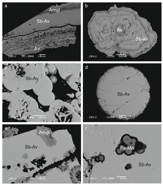 The colloform structures are well shown upon examination of the samples in reflected light and in SEM (Figure 3). They are represented by the following varieties: rhythmic-zonal, showing alternation of avicennite, Sb-rich avicennite, and amgaite (Figure 3a), concentric-zonal (Figure 3b), kidney-shaped and spherulitic (Figure 3c,d). The replacement of avicennite of a massive structure by amgaite of a porous texture is also observed (Figure 3e). Occasionally, concentric zonal aggregates of Mn-Fe variety of amgaite are observed in Sb-rich avicennite (Figure 3f). Some aggregates of Sb-rich avicennite contain native gold inclusions (Figure 3g,h).
