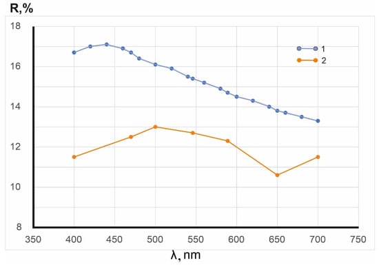 In reflected light, Sb-rich avicennite is light gray, isotropic. Internal reflections are absent. Reflection is very low; the reflectivity curve is of mixed type with a small maximum in the blue part (Figure 4). The reflectance values of the Khokhoy avicennite are shown in Table 1, compared to avicennite from the Carlin gold deposit in Nevada, USA [12]. It is seen that the reflectance values of the former are higher than those of the latter, which may be due to differences in the chemical composition of the two minerals and their grain morphology. The mineral from Nevada is chemically pure in contrast to avicennite from Russia. In addition, the grains have a porous structure, which, notoriously, can significantly understate the reflectance values.
