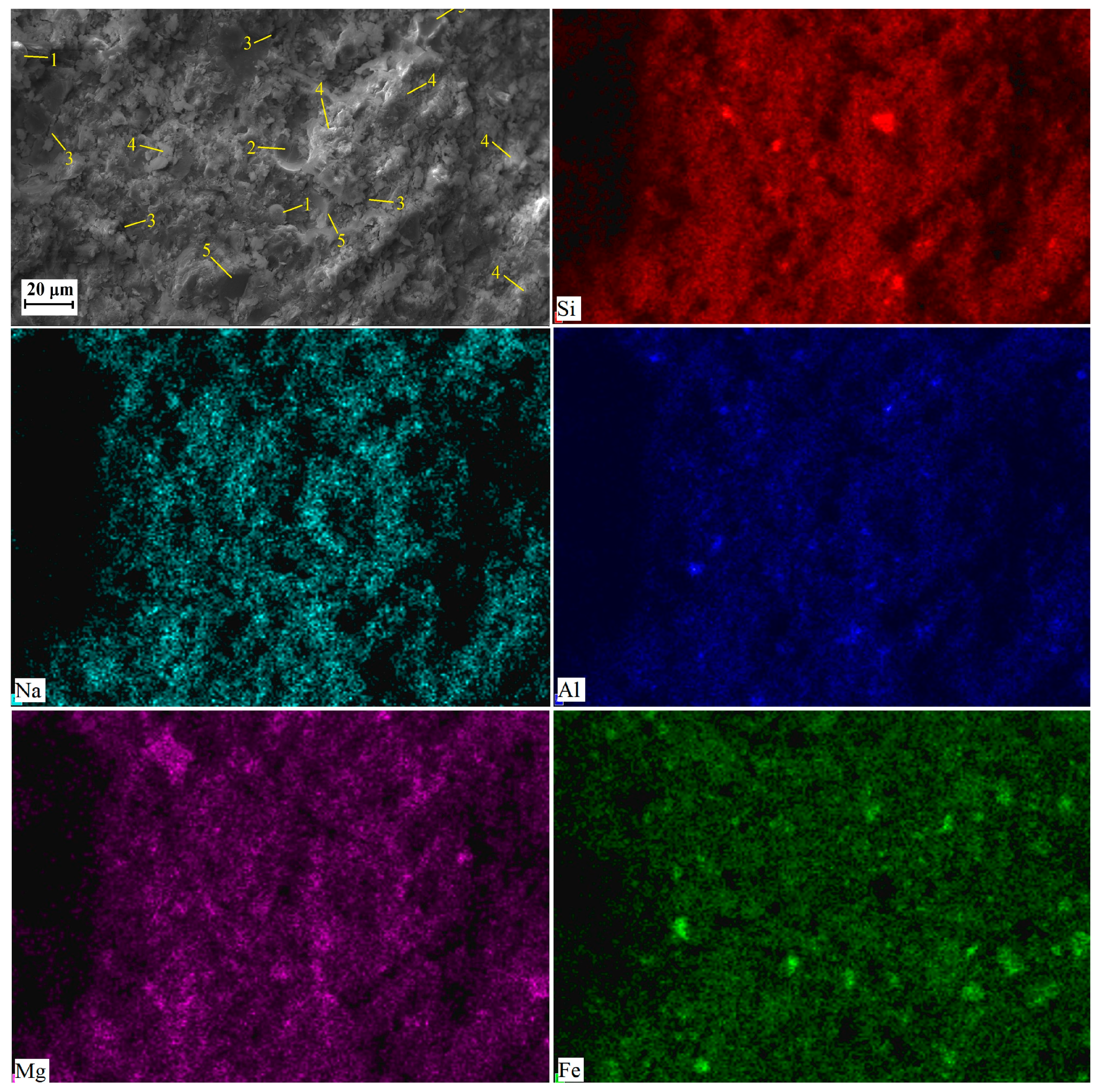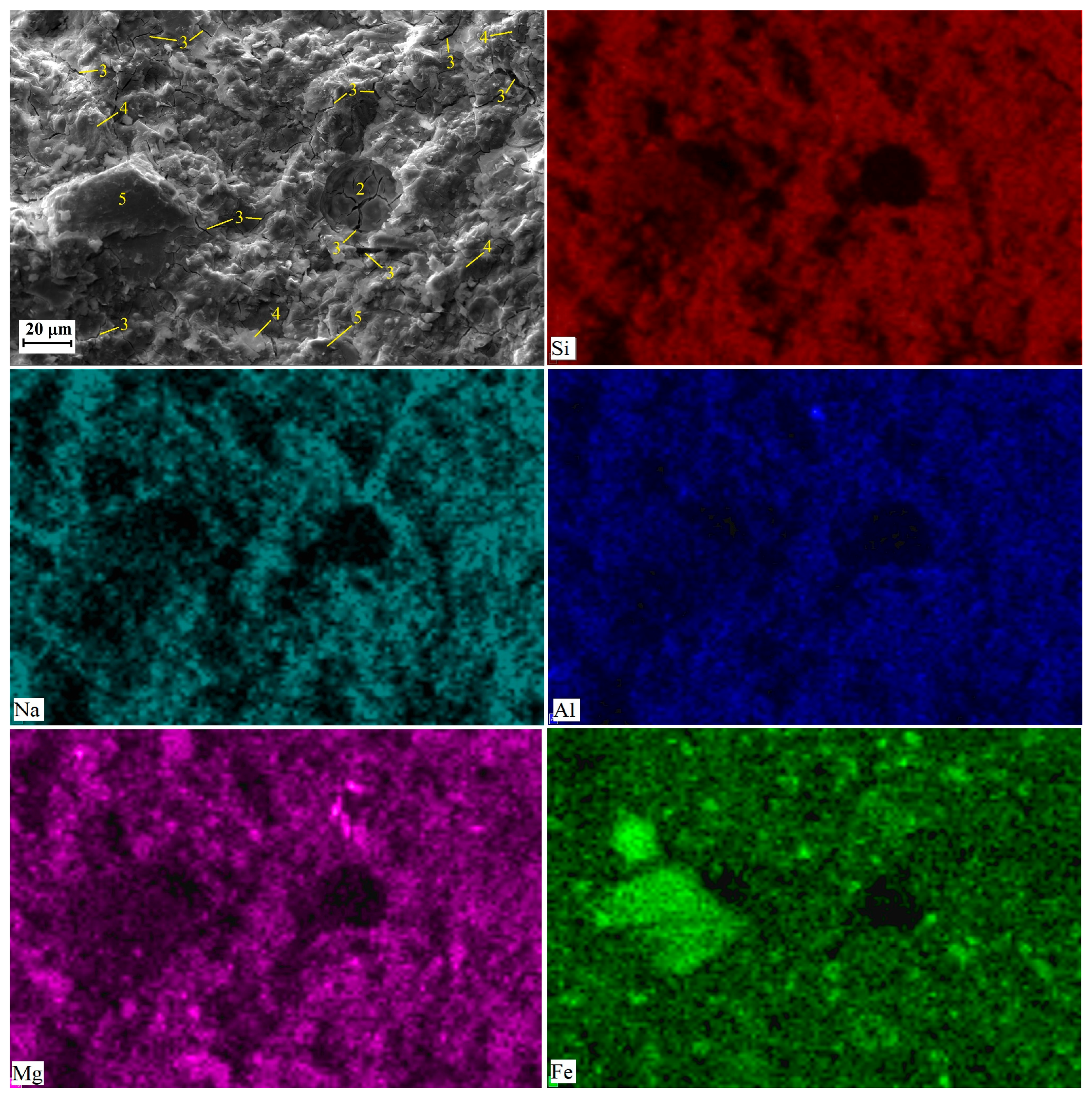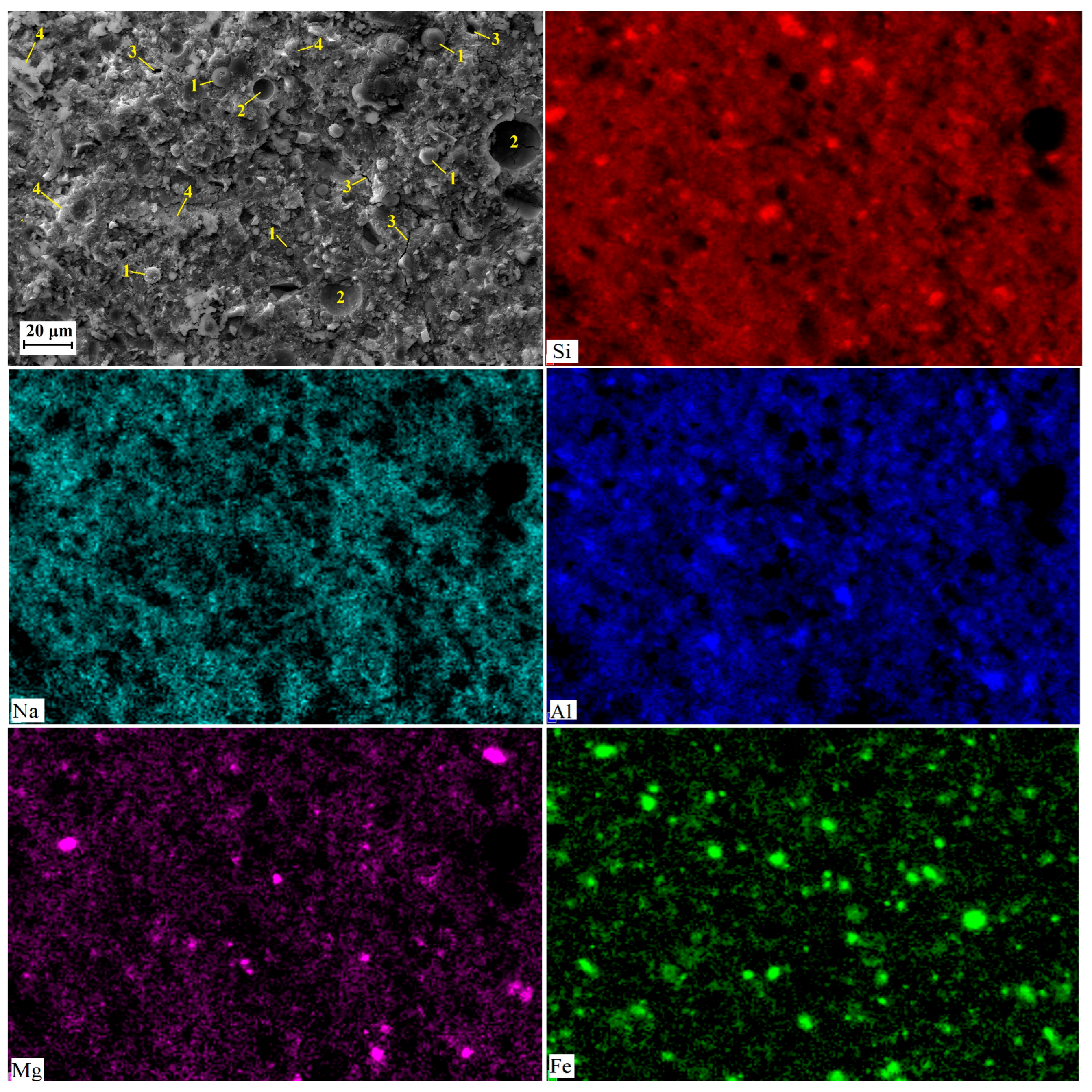 - Lu, Y.; Cui, N.; Xian, Y.; Liu, J.; Xing, C.; Xie, N.; Wang, D. Microstructure Evolution Mechanism of Geopolymers with Exposure to High-Temperature Environment. Crystals 2021, 11, 1062. [Google Scholar] [CrossRef]