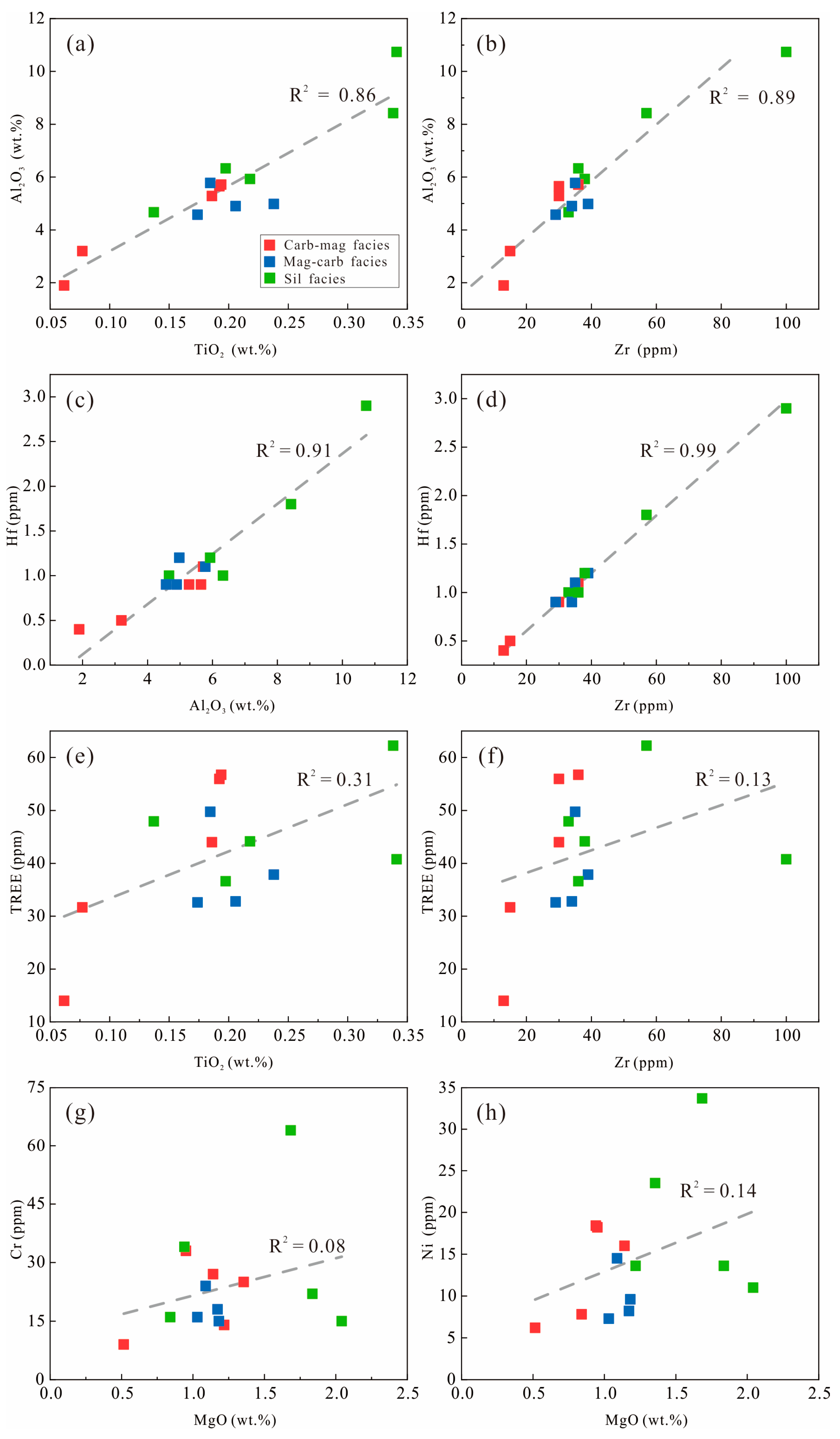 - Murray, R.W.; Buchholtz Ten Brink, M.R.; Gerlach, D.C.; Russ, G.P.; Jones, D.L. Rare Earth, Major, and Trace Elements in Chert from the Franciscan Complex and Monterey Group, California: Assessing REE Sources to Fine-Grained Marine Sediments. Geochim. Cosmochim. Acta 1991, 55, 1875–1895. [Google Scholar] [CrossRef]
